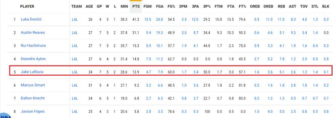 目前,拉拉维亚场均得到12.9分5.1篮板2.6助攻1.4抢断,投篮命中率60.0%,三分命中率50.0%,罚球命中率57.1%。拉拉维亚的三分命中率是湖人队中最高的。他是球队的头号射手。拉拉维亚最近3战的抢断表现也不错,他还是防守好手。难怪雷迪克会形容他是东契奇和里夫斯身边的优秀补充。